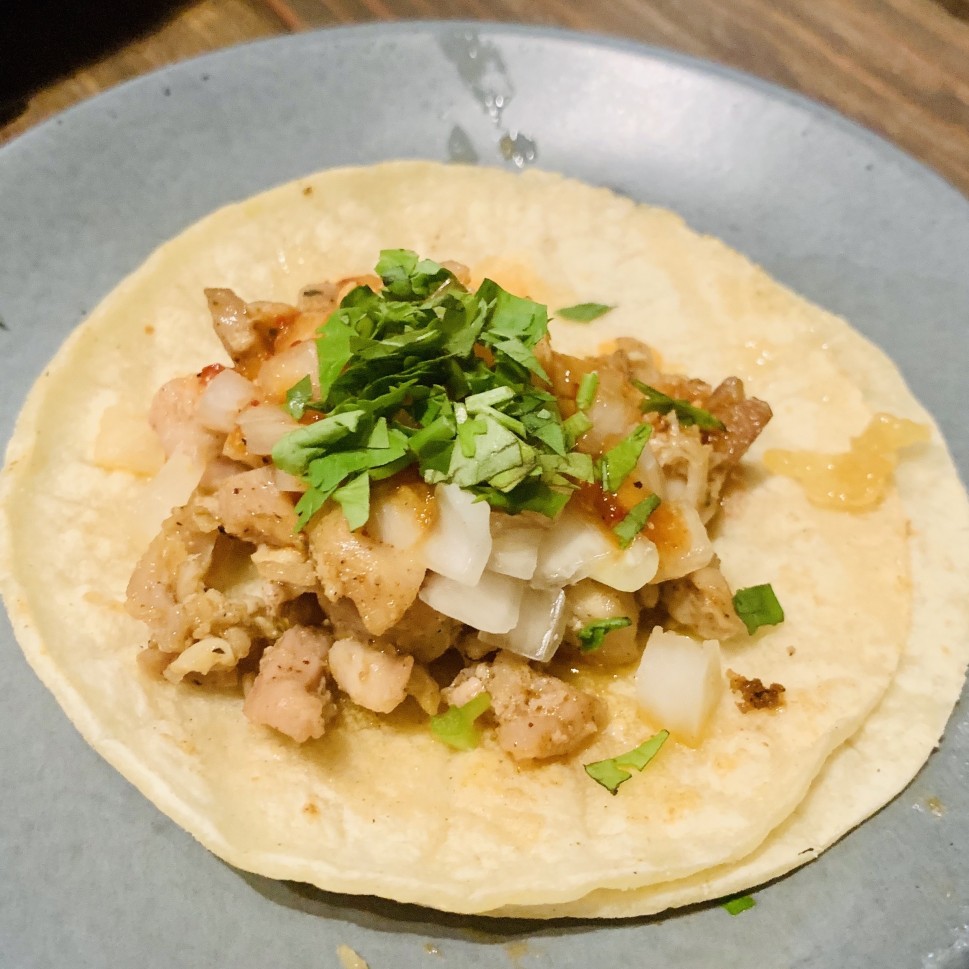 オレンジマリネした豚肩ロースの柔らかラード煮込み。ホットソースで、というメニューです。