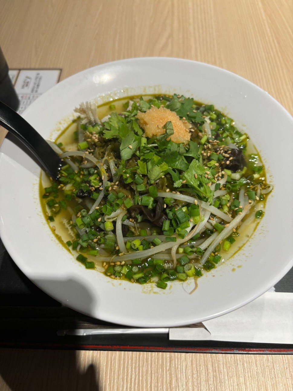 今回はスープは酸辣緑スープにしてみました!酸辣だとパクチー、ニンニク、ネギは追加¥50かかるみたい!