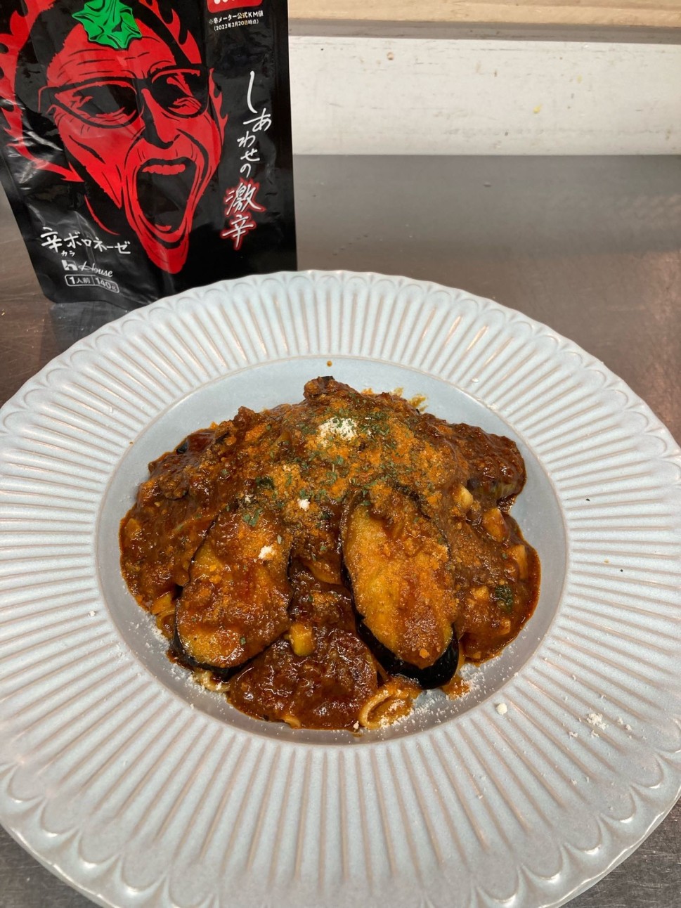 みじん切りのにんにく、玉ねぎ、ズッキーニに少量のデミグラスソースとトマトソースとS&B燃辛唐辛子を6振りくらい追加、さらにトッピングに素揚げのナスと粉チーズ…