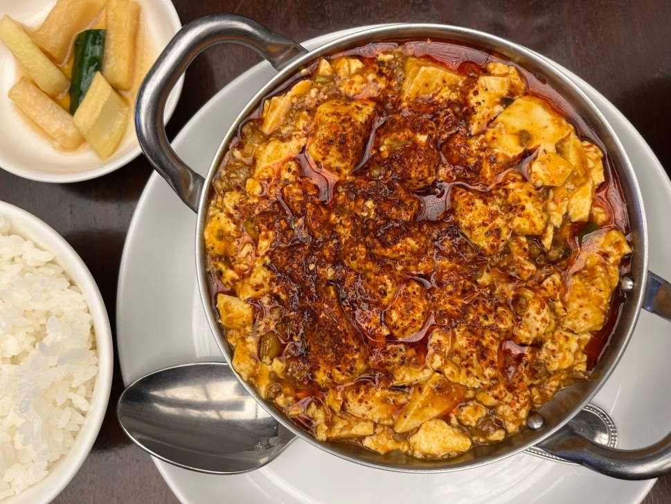 花椒と唐辛子が効いた四川麻婆豆腐のランチ。白ごはんとの組み合わせが、特に二日酔いの昼などには最高です!