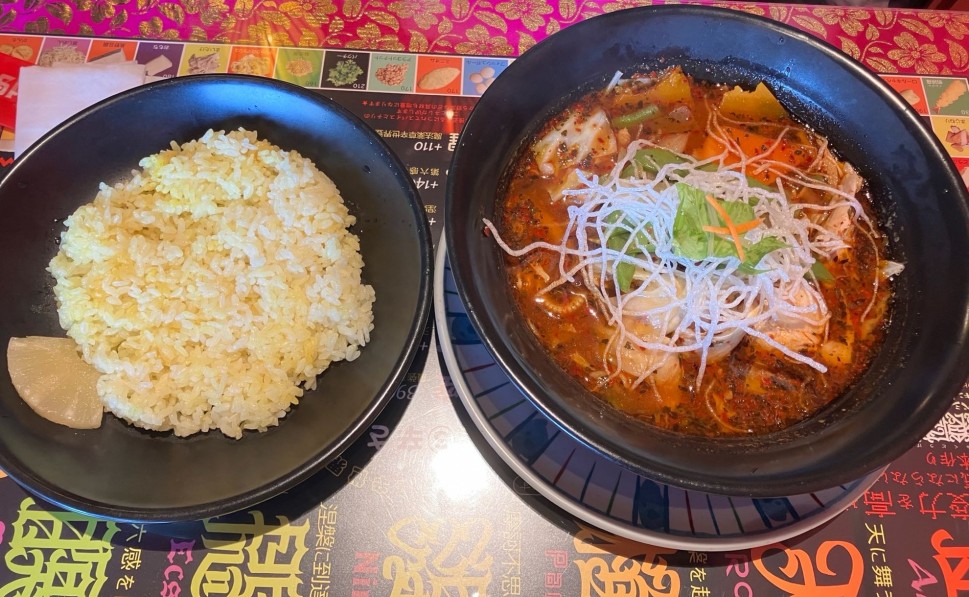 辛さ的には中本の北極ラーメンぐらいでした。スープカレーなので食べやすく、そこまで後に引かない感じの辛さです。一緒にチャイティーもいただきました