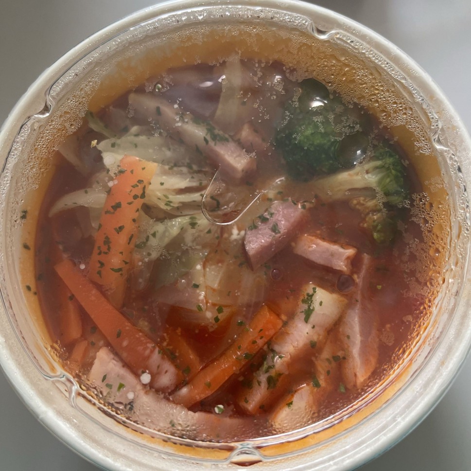 ミネストローネみたいな、マカロニ入りの具たくさんスープでした。