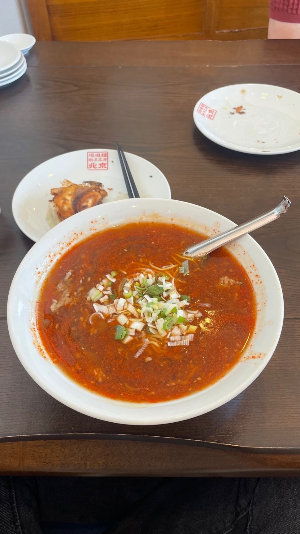 スープがサラサラしていた。テーブルに運ばれてきた瞬間から唐辛子の刺激が目を攻撃してきた。辛さは衣笠店より強く感じた。辛いけど、旨みがあって美味しい!