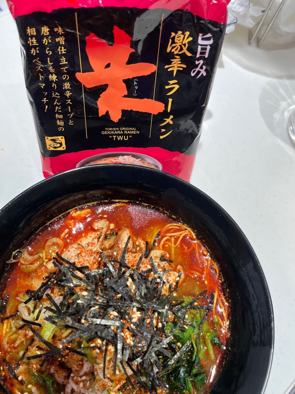 旨み激辛ラーメン朱Amazonで購入。あっさり系の味噌味スープ、麺も豚骨ラーメンみたいなストレートでした。ユウキの激辛ラー油入れてやっと2.5くらいの辛さになりました。