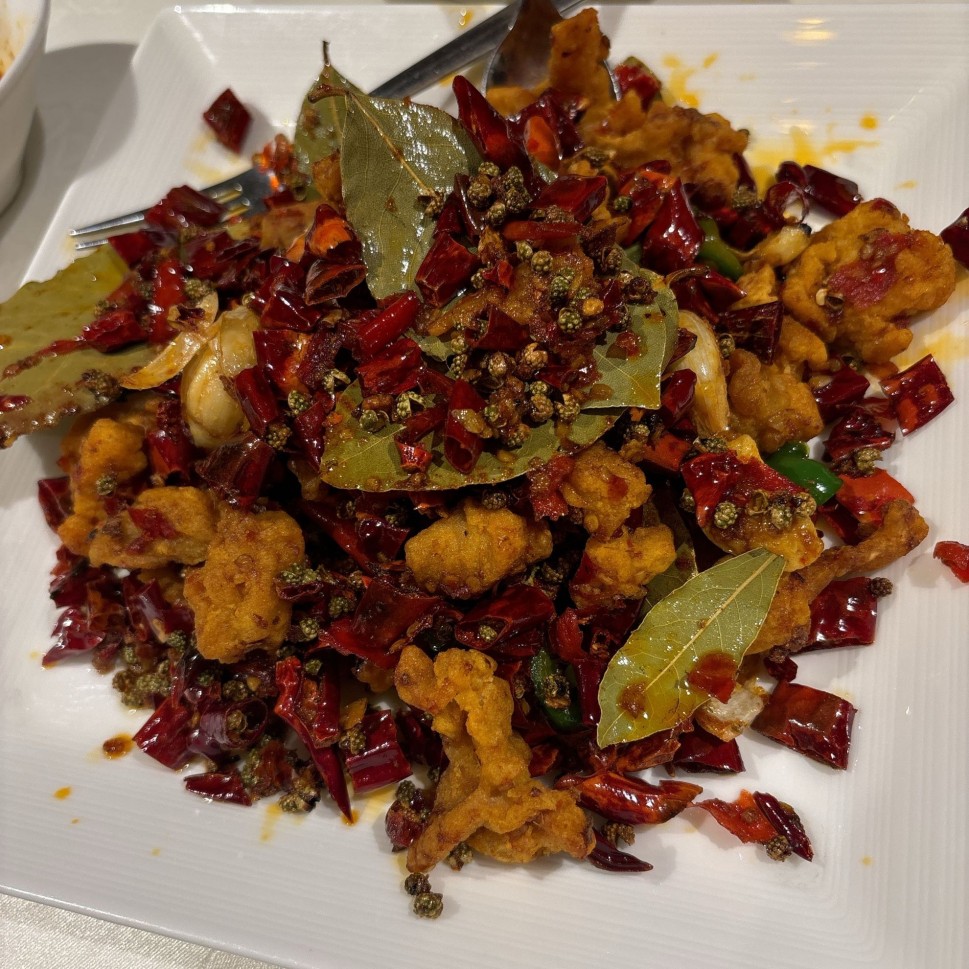 鶏肉(唐揚げ)と一緒に唐辛子、山椒を絡めて食べると山椒の香りと強いシビシビ感を得られる一品です。