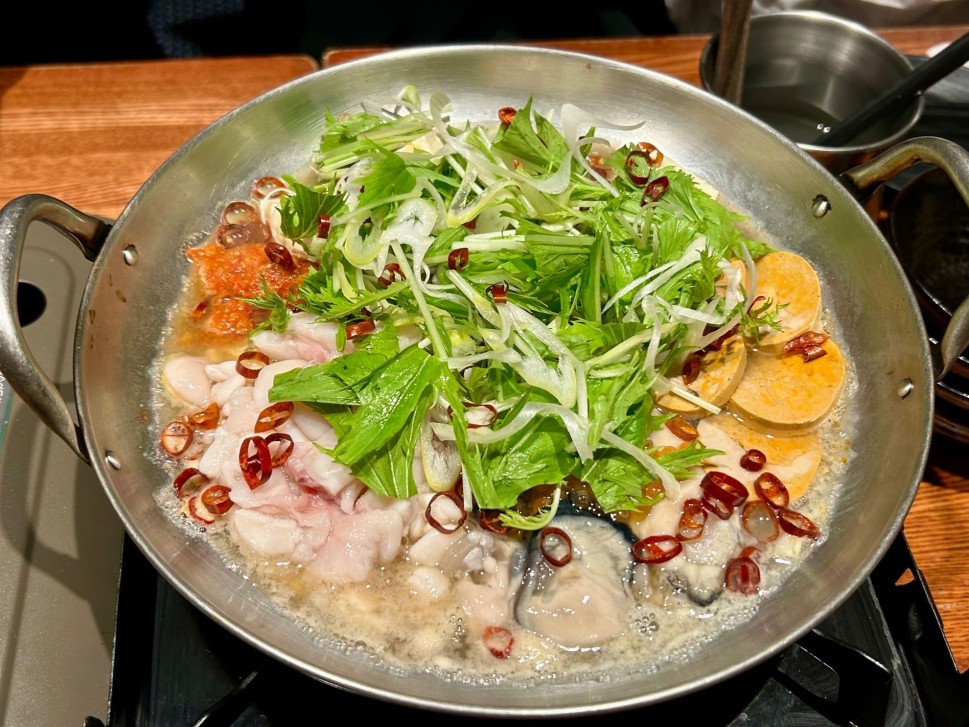 居酒屋の辛い鍋はあまり辛くないのですが、唐辛子の輪切りと辛味ペーストが効いて旨辛でした!