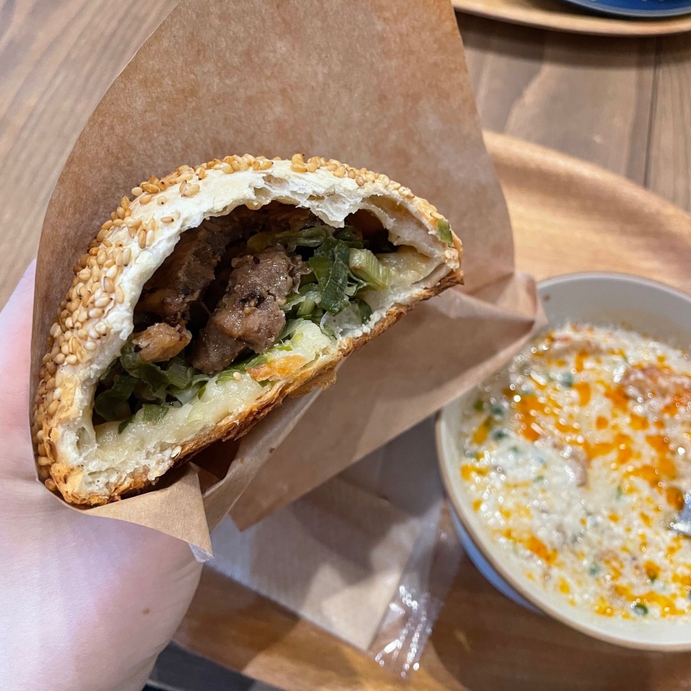 台湾料理の胡椒餅。この店では11時から頼めて、日によっては1人いくつまでと制限がでるほどの看板メニュー。胡椒のいい匂いで意外とちゃんとピリピリしました。台湾で食べた屋台の胡椒餅はパクチーがたくさん入っていましたが、ここのは入ってなかったです。でも満足度の高い一品🌿