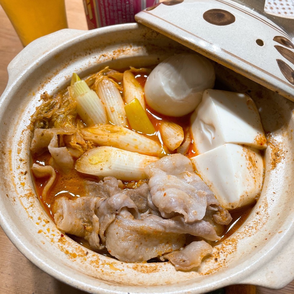 私は白菜、豆腐、豚肉、ネギ、ゆで卵を入れました🥚締めはお米と追いたまごでおじやにしました。