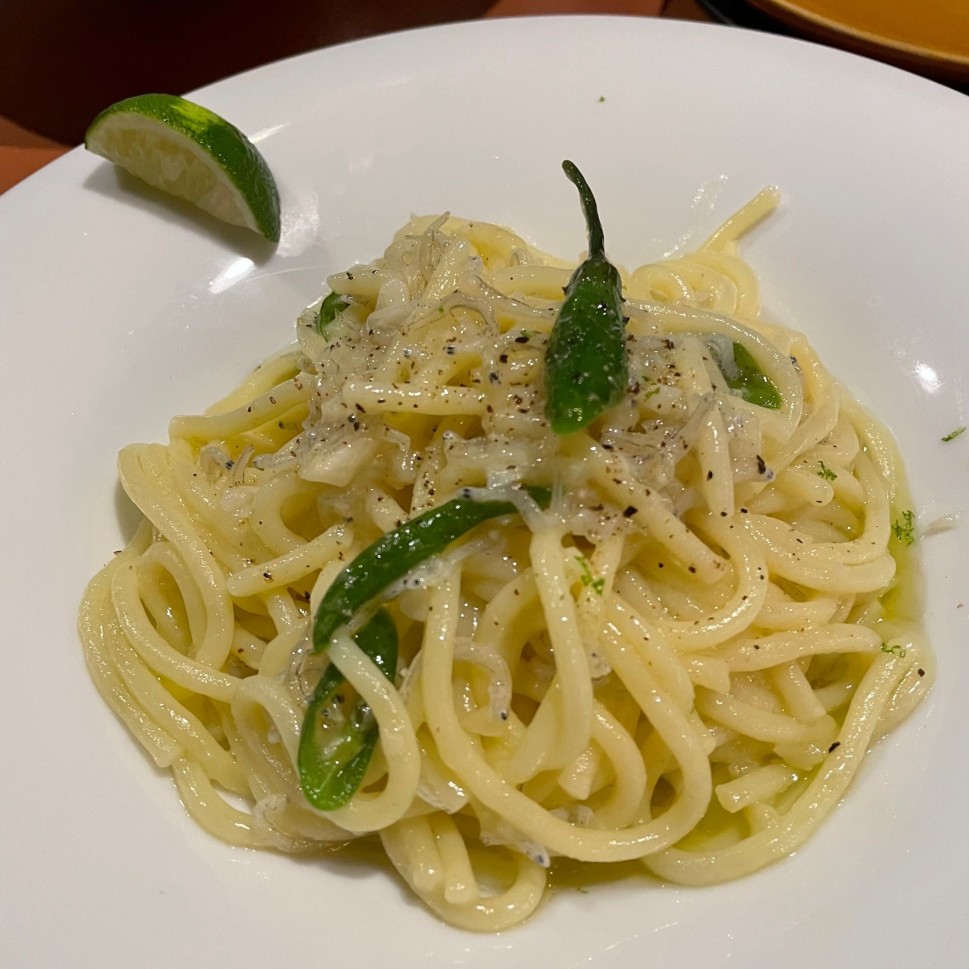 まさに"もっちもちの生パスタ"の世界。ここは家族で愛用しているパスタ屋さんです。まじで生パスタの世界観変わります笑。は、置いておいて、日替わりランチメニューで偶然辛めメニューが出現していたので注文。写真奥に映っている「へべす」という柑橘フルーツを絞っていただく辛×爽やかな世界でした🥹✨青唐辛子しか辛い要素はありませんでしたが、和パスタの調律が素晴らしくずっと食べていたかったです😭。