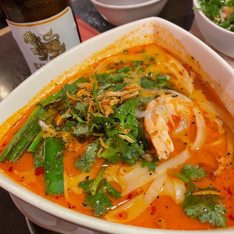 辛めに注文させていただきました!甘さと辛さとパクチーが共同生活されていてほんとに美味しい!🍤🌿SINGHAビールとの相性抜群ですな🦁