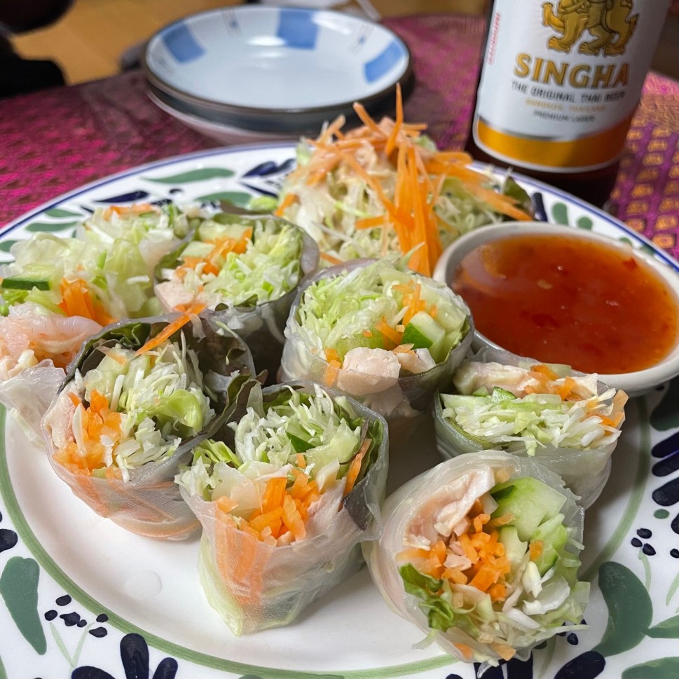 みつけました!!バンコクの家庭感溢れる隠れ家的タイ料理屋さん!ここよ生春巻き、今まで食べたどの生春巻きよりも美味しかったです。甘辛なソースでした☺️シンハービールの進み具合が半端なかったです。