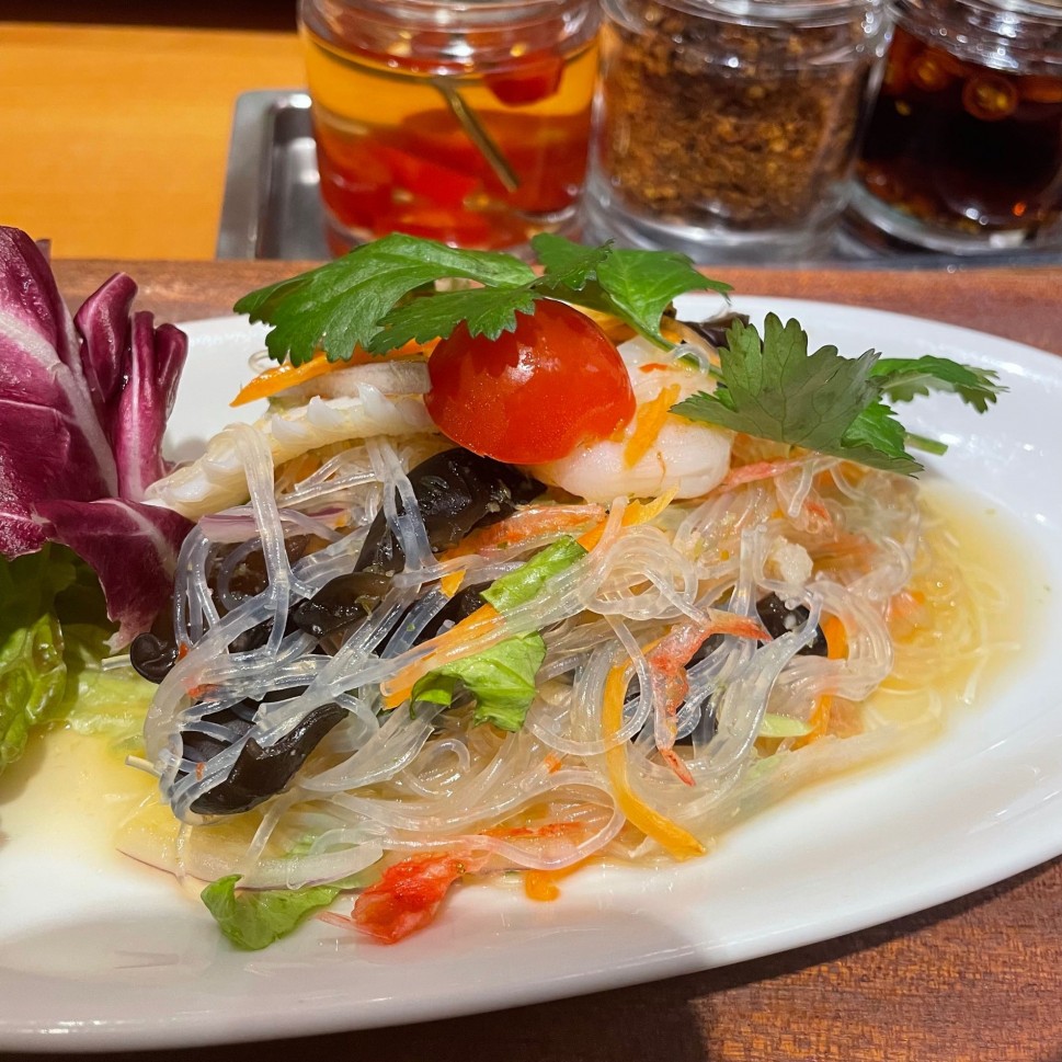 ドレッシング?かかってるソースが辛い!ツンと酸味があって、パクチーにて追いエスニックー!!そこへシンハーを流し込みます。酸味✖️辛さいいですね。刺激だらけですが、疲れを癒してくれました☺️
