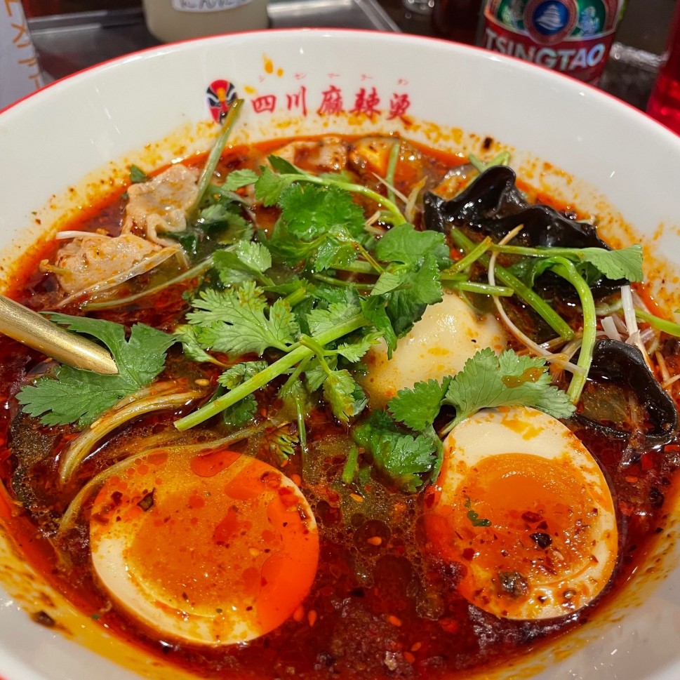 安定の美味しさ。今回は激辛の手前の大辛を久しぶりに選んでみました☺️ここが一番辛さとシビレ、具材の旨さが調和するところだと思います☀️板春雨にパクチー、卵、水餃子、豚肉、しいたけ、キクラゲ。青島ビールでもう完璧。平日頑張りました!!!!