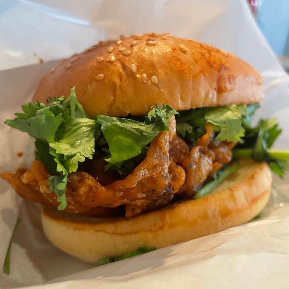 人生初フレッシュネスバーガー笑🍔トムヤムクンとグリーンカレーがパクチー盛り盛りで発売されたと聞いたので…!✨絶対ビールなのでうーばーで。