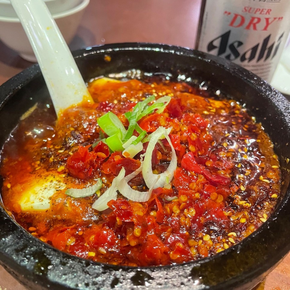 やっとお店に食べに来れた!!という感動激しい見事な見た目。バチバチに激しい辛さを粒子で飛ばしながら熱々の鉄土鍋で運ばれてきます。写真をパパッと撮ったらお店の方がうまく混ぜてくれます。辛かったぁ〜〜熱々で食べれてよかったです☺️痺れも好みでした!
