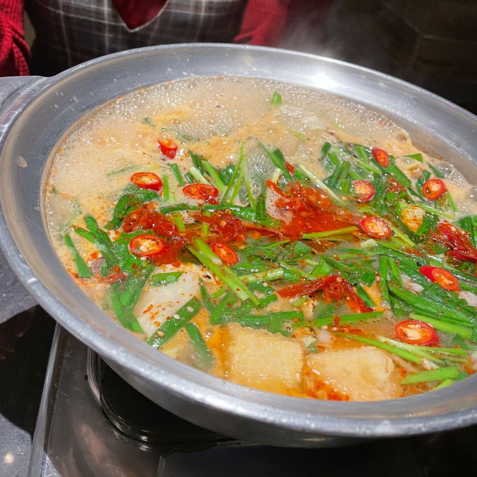 赤いの全部唐辛子です。天才。写真は混ぜる前ですが食べ終わる頃には鍋が真っ赤になってました。辛いもつ鍋は何故こんなに美味しいのか…。