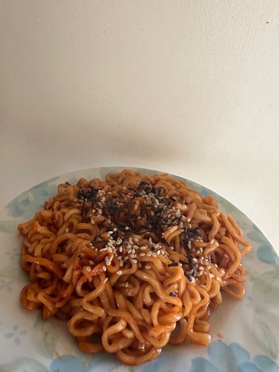 香りはザ・プルダック!というくらいシンプルなプルダック感のある香りがします。ふりかけをかけた後は海苔の香りが強い様に感じます。