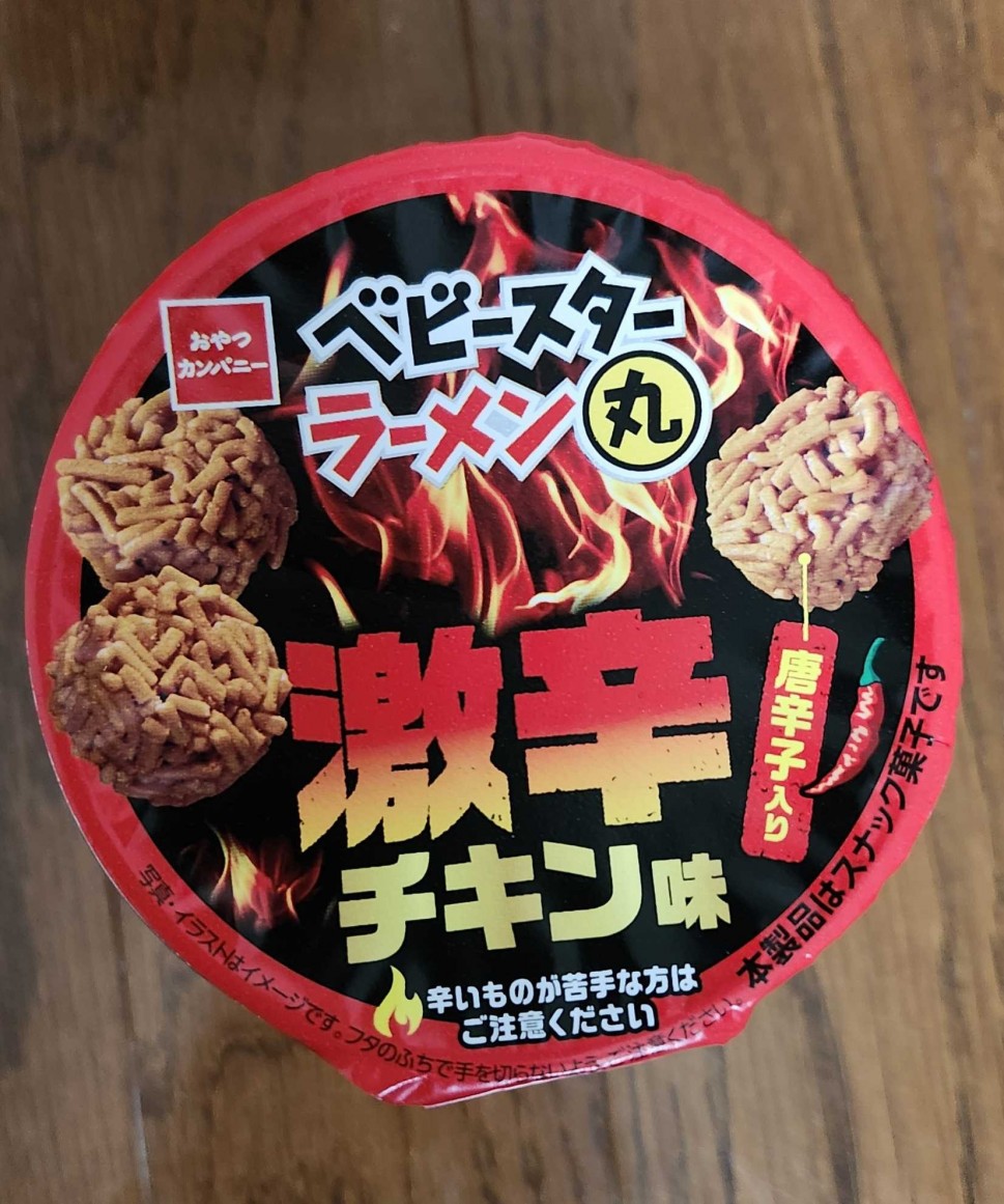 同社のベビースターラーメン辛さ3倍ピーナツ入りと同じ辛さです🎵お好きな食感、ピーナツの有無で選ぶと良いかと思います😁どっちも美味しいですし😋