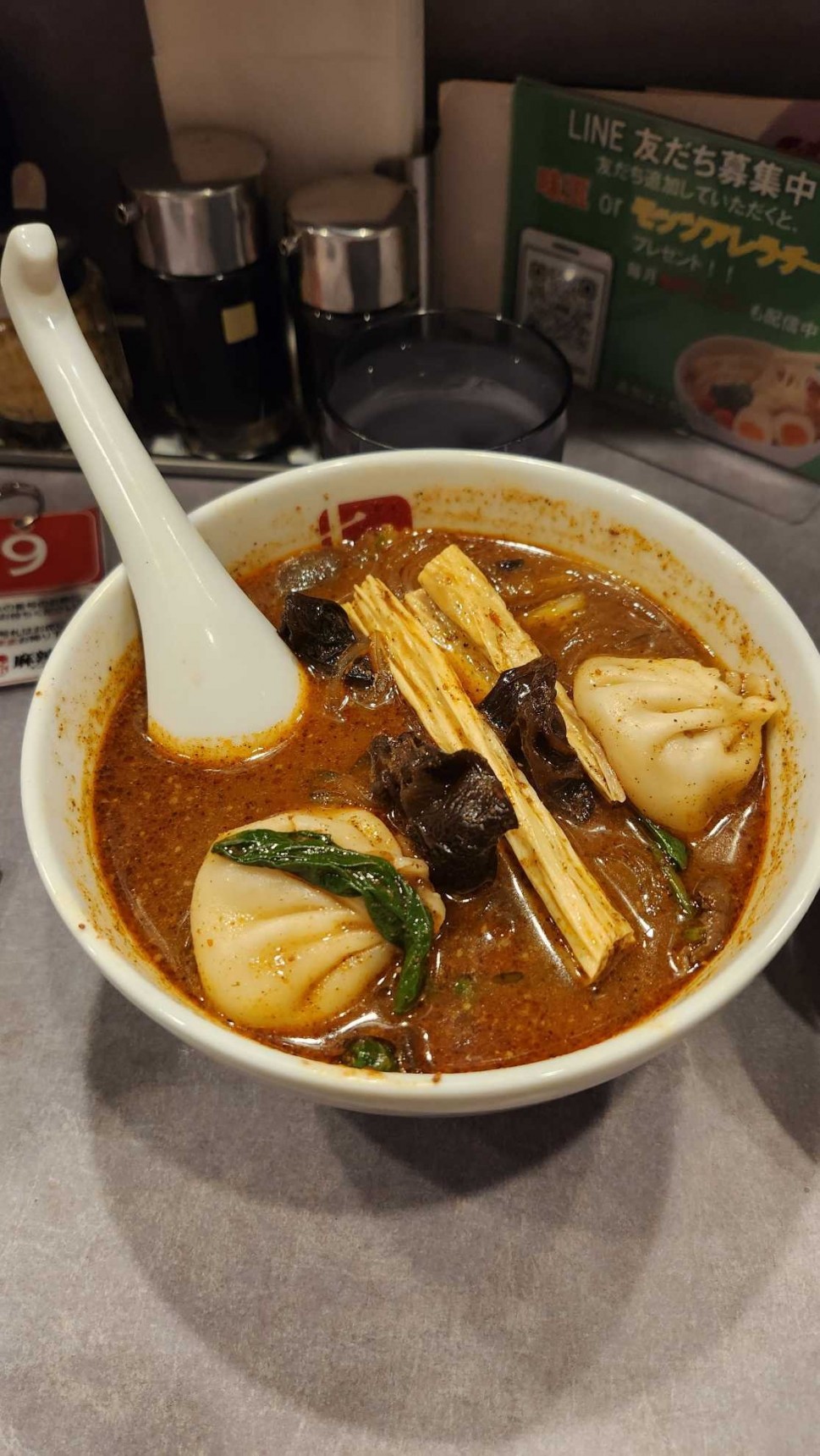 店員さんから初めての方は1辛をと勧められましたが迷わず10辛を注文😂辛さも痺れもちょうどよく完飲完食です🎵4辛以降は+80円みたいです💦激辛慣れしてる方なら美味しく頂けるかと思います🎵麺、スープ、具材選ぶのが楽しいお店でした😁
