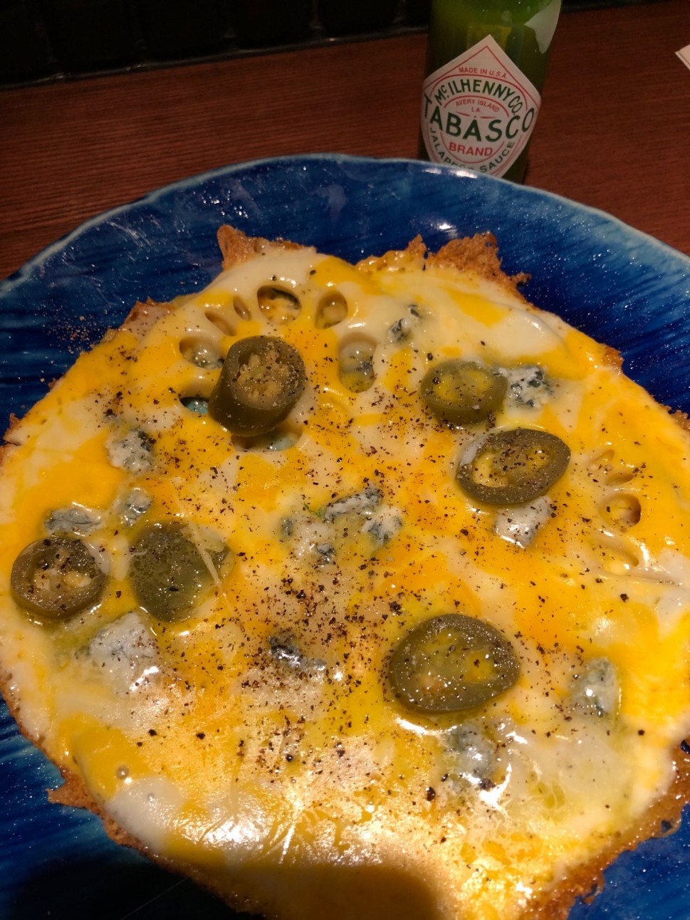 かつてピザ屋で働いていたときのブルーチーズ×ハラペーニョのピッツァのオマージュでこのメニューを作ったのだそう。ピザ生地の代わりにレンコンってすごいよなあ、酒飲みのことをわかってる😆