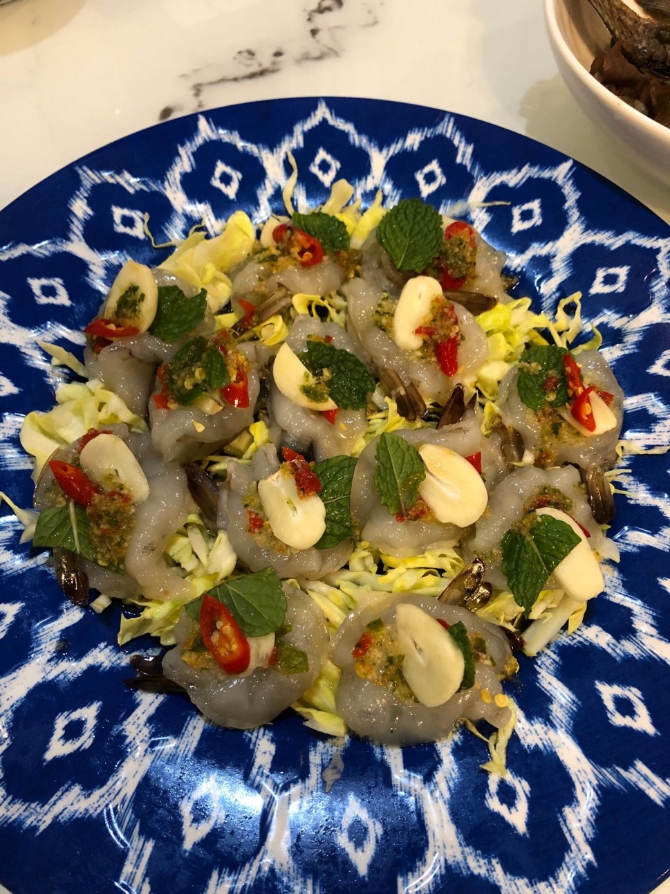 海老の刺身に唐辛子やニンニクなど香辛料が乗ったタイ料理🇹🇭