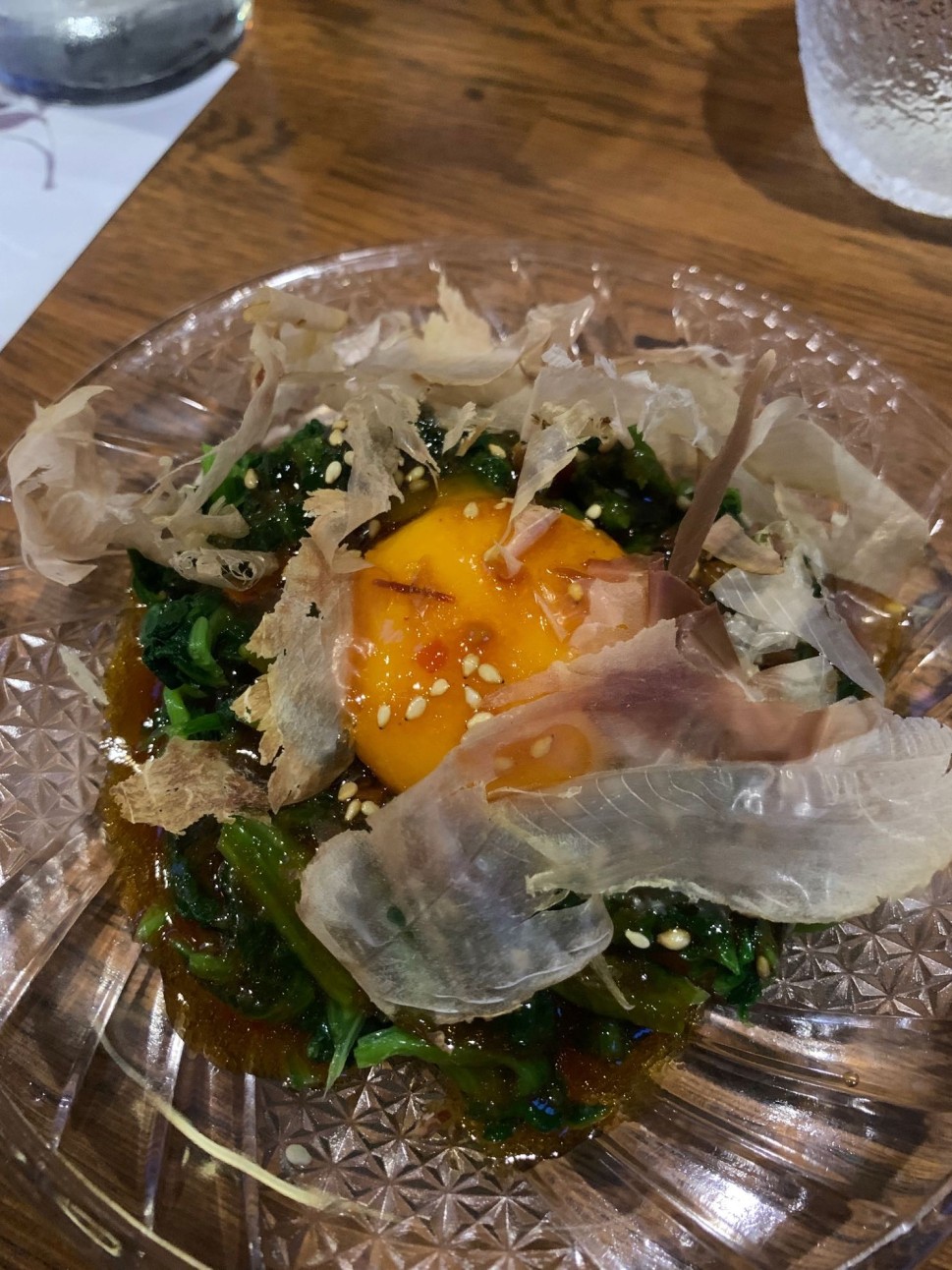 たぶん豆板醤を和えた醤油味タレがほうれん草と卵黄に絡みます!