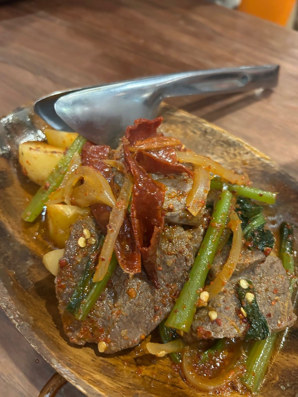 牛肉、じゃがいも、唐辛子の煮炒め。