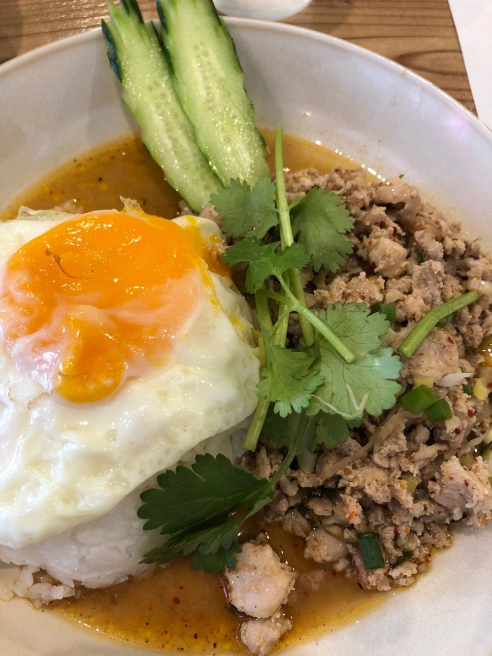 見た目はガパオに似てるけど、鶏肉だからちょっとさっぱり。味付けもナンプラーと酢強めで爽やか系メニュー。うーん、これはビールだなあー。
