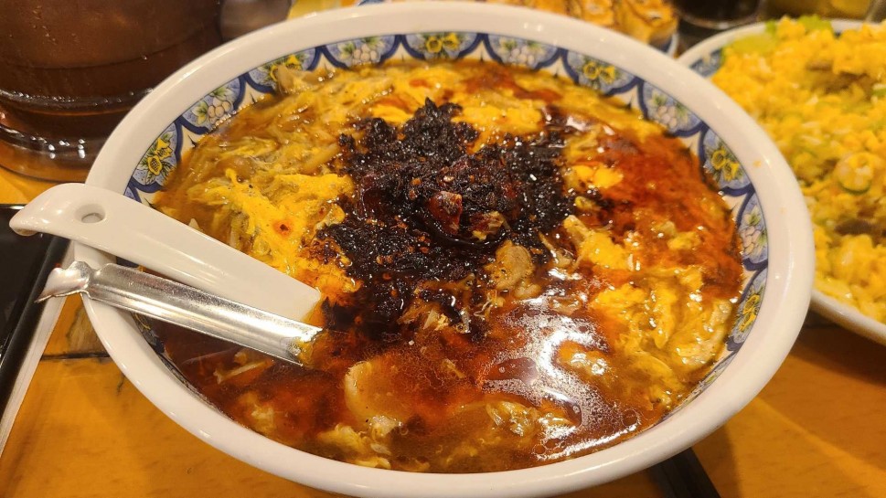 卓上の辣油の具を入れると辛さ増しに出来て美味しい!スーラータンメンなので酢っぱさが辛さを中和してるので、激辛という名前ですが怖くないですよ!