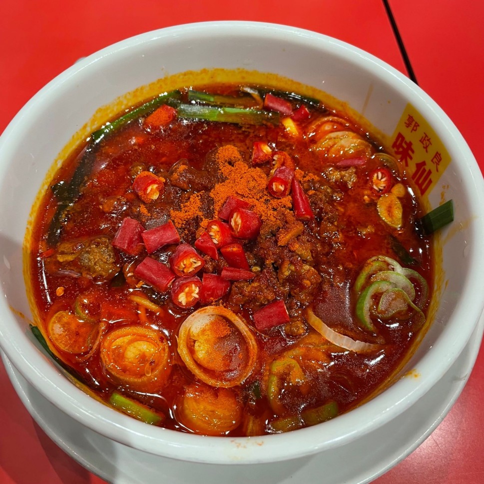 食べ進めると唐辛子が効いてきて顔に汗……美味しさが辛さにギリギリ勝つけれど、ジワジワと辛い。