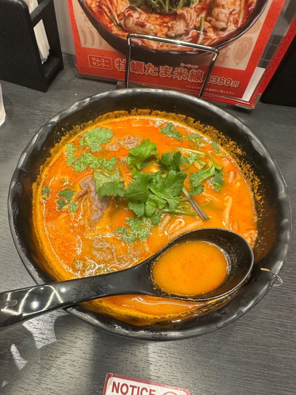 麻辣8辛パクチー🌿と赤身牛肉トッピング辛かった!ちょうどいい辛さ🙆♀️麺があまりスープに絡まないので辛すぎても食べれる気がする。スープは飲めば飲むほど辛い🥵でも求めていた辛さなので満足!!