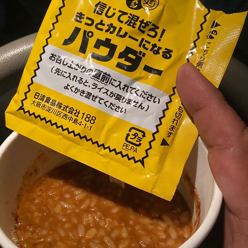 超久しぶりの日清のカレーメシ!今日は初めてキーマカレースパイシーに挑戦!…と何やらカップの上に別カップ?中にはカレーパウダーとオイルが入っているではありませんか!ふむふむ、キャッチコピーの通り信じて混ぜること1分!良い具合にとろみのあるキーマカレーメシに変身!辛さは適度にぴりりのウマカラ〜!
