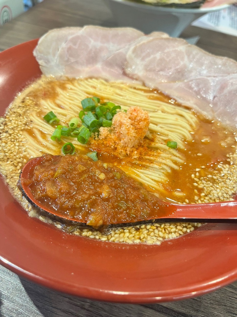 えびが濃い!追加料金無しの最辛の5辛を頂きましたが、無理なく食べられる辛さです。海老もトマトも、辛味に負けて無くて美味💓
