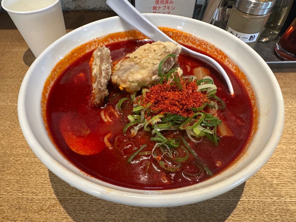 食べ始めは甘辛な感じ。底にドロドロの辛味が沈んでいたので麺で混ぜながら絡めながら食べると中々の辛さ。3枚も入っているチャーシューの竜田揚げと玉子が逃げ道になるので、辛さの割には完飲完食楽だと思う。