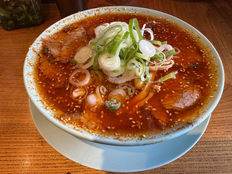 唐辛子の味がしっかりするぐらい入っていますが辛さは弱め。辛辛魚と辛ラーメンの間くらい。卓上の唐辛子を追加すると辛さはそれ程プラスされませんが美味しいです。