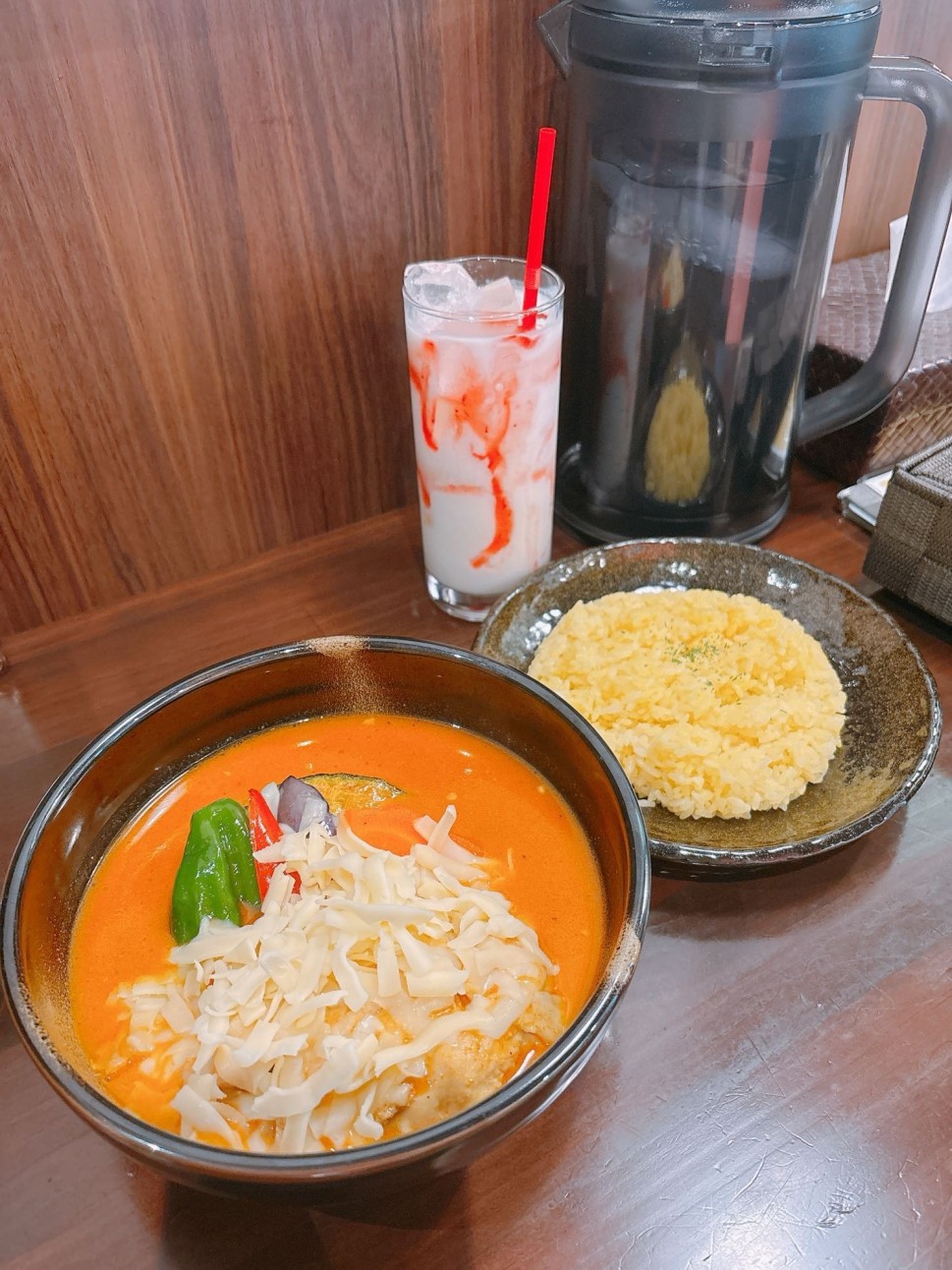 チキンココナッツカレー(10辛・ゆで卵抜き・チーズトッピング)とストロベリーラッシーを注文!
