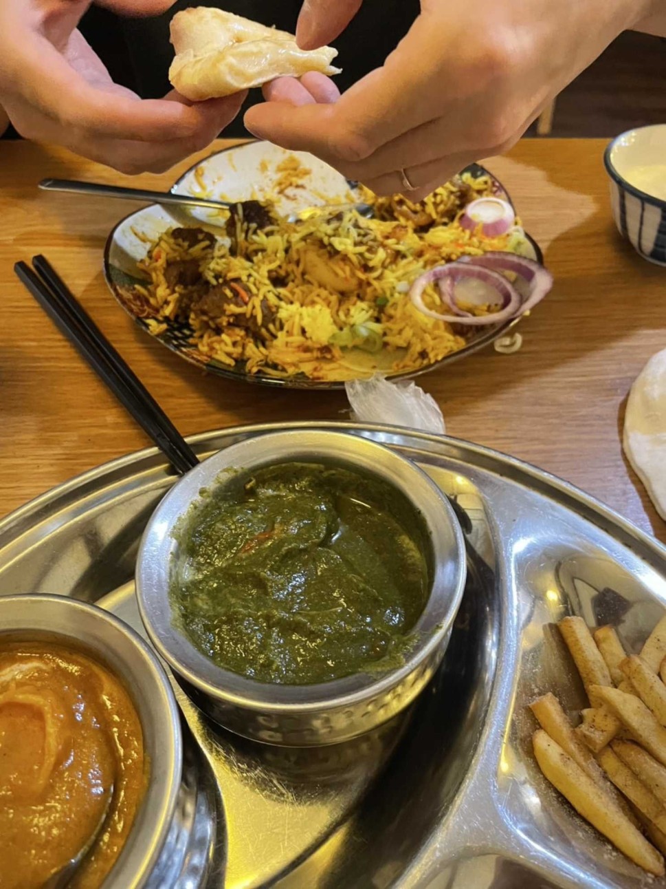 奥の料理が今回食べたビリヤニです。(食べかけですみません。)辛さは1-7辛まで選べるというので反射的に7辛をチョイス。「カライヨ、ダイジョブ?」ちょっと不安になったけど引き下がるのもカッコ悪いのでそのまま注文。具はエビ、チキン、マトンの選択肢があり、今回はマトンを選びました。いよいよ着丼。ぱっと見辛そうに見えませんが、パラパラの米の下にデカいマトンが埋まってて、こいつが激辛ソースをたっぷりまとってます。しっかり混ぜて食べるのが吉。一口目…たいしたことないな、びびらせるなよ(笑)二口目…ん?三口目…あっやばいっ…無事完食&後日体調不良。ココイチの20辛と同レベルでしょうか。1000円でこのボリュームと味ならかなり満足😆心配してヨーグルトをサービスしてくれた店員さん、ありがとうございました。