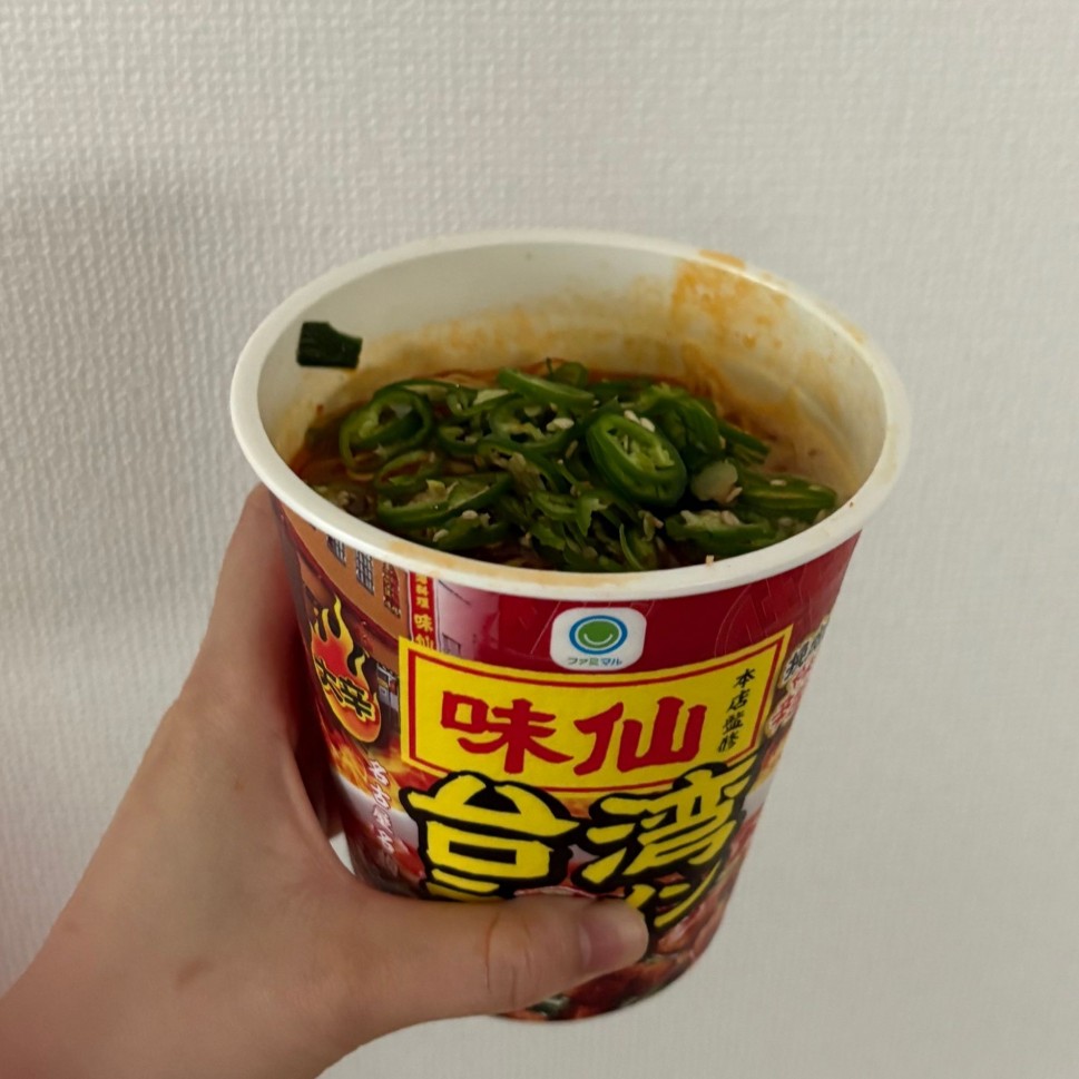 初めて食べました!醤油ベースで辛ラーメンくらいの辛さ!青唐辛子二本と燃辛追加して食べました!