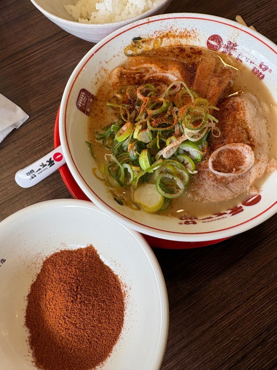 ミニにしたら、息子のお子様ラーメンと同じサイズがきた!笑、思ってたよりちっさくて笑っちゃった笑持ち上げると汁がほとんどなくてそこに追加5辛するとドロドロ粉っぽい感じがした!ハバネロの味がしっかりしててしばらくお腹がポカポカ!せっかくの天一そこまで追加しない方が美味しかったかも!美味しかったけど!!