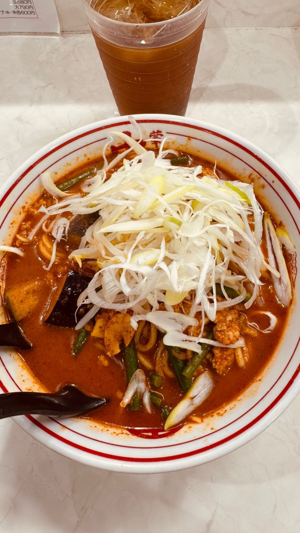 北極ベースのスープにナス、、もやし、にんにくの芽、ひき肉が入り、ねぎがトッピングされています