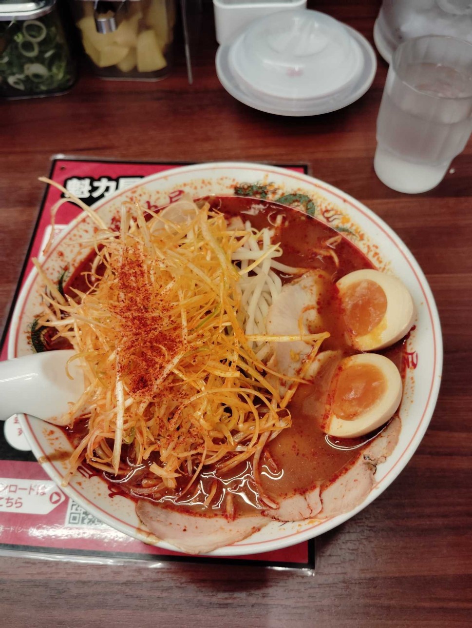 辛さはマックスで3倍まで選べますが、3倍でも辛さはほどほどです。しかし卓上のヤンニンジャンを足すと劇的に辛くなります。足した後の辛さの評価は2.5KM都しておきます。ただ辛いだけでなく、しっかり味噌ベースの旨味もあり、とても美味しくいただきました。太麺も選べると尚良いかと思います。