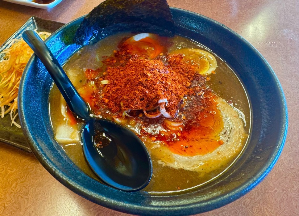 たくさん汗をかいたあとだったので、とろみのあるスープの塩気と唐辛子の辛みが中太麺に絡んで、魚介の味も濃くめちゃ身体に沁みました〜(๑ ᷇ 𖥦 ᷆๑)♡