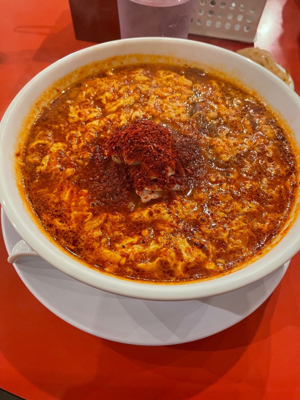 蕎麦粉麺、にんにく増で。ふわふわ卵と辛さがマッチしておいしい!無料のもやしを入れても美味しいです。辛さもしっかり辛いです。