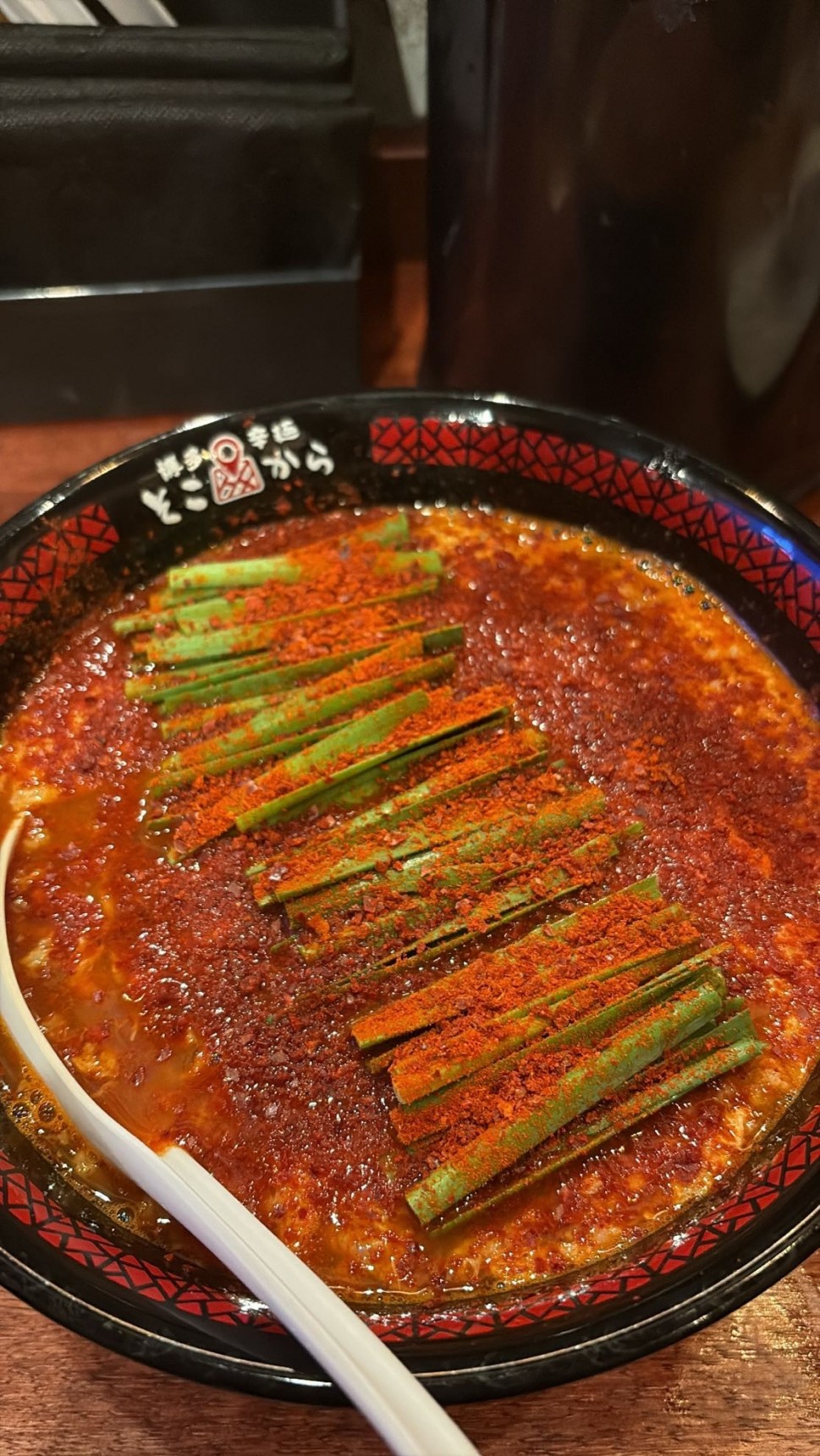 辛麺色んなとこの食べてきたけどここが一番好き🌶️❤️🔥これはにんにくとニラ増し🧄スタッフの方いわくメニューには激辛までしか書いてないけど数字で言うと10辛で最大50辛までできるそう!50辛だと1600円らしいので次回はそれにする😽