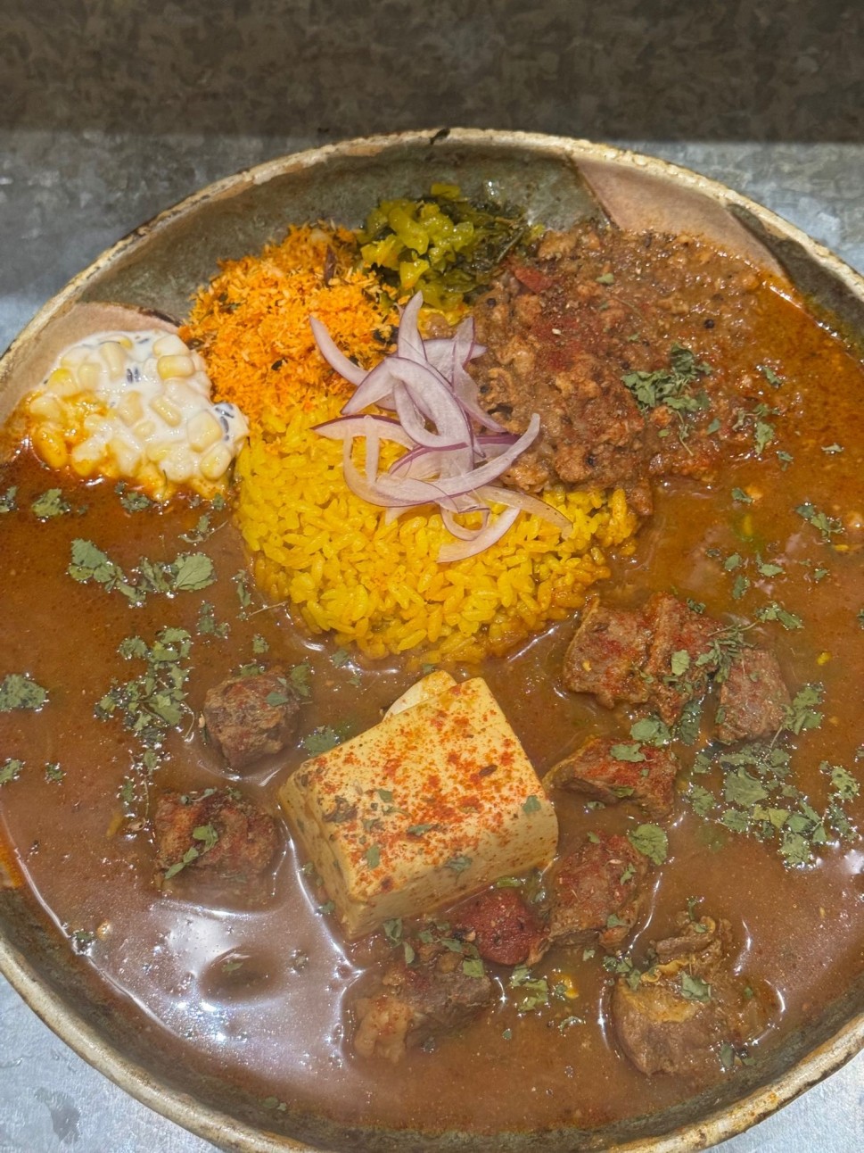 キーマあいがけで。変わらずのスパイシーっぷりがやっぱり素敵。でも、そんなに味が濃ゆすぎないとゆうか、冷めてきたらちょいしょっぱいくらい。ごはん少なめでお願いしましたが、めちゃくちゃボリューミー!おいしー✨✨