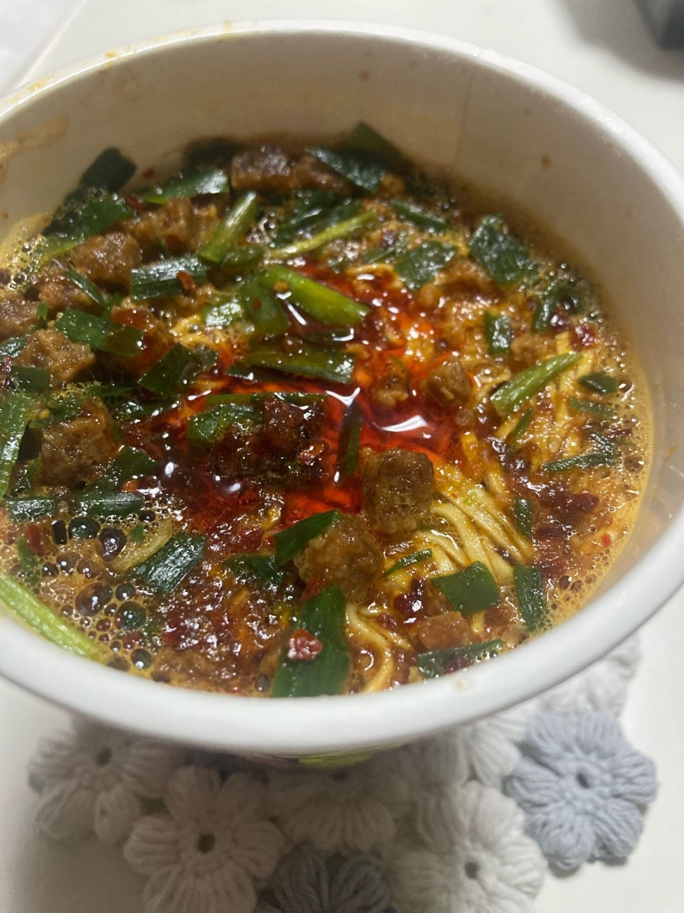 謎肉より少しジューシーな具がゴロゴ、ニラが入っていてニンニクの効いていない辛麺の様な感じでした😋