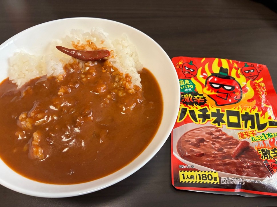 おつカラさまです。ジャケ買いってやつです。唐辛子一本入りとか攻めてます。カレールーは結構もったり、まずコクがきて後から辛さが立ち上がります。辛さは刺激的過ぎず、唐辛子をかじると確かにハバネロです。価格を考えるとかなりコスパ高し。途中から追いデスソースで辛味ブースト、激辛カレーやっぱりおいしい。ごちそうさまでした。