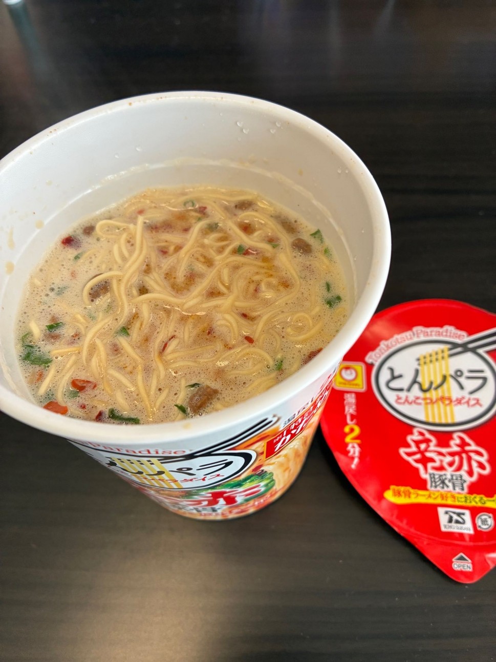おつカラさまです。ワゴンセールで見つけたので購入。待ち時間2分は嬉しい。スープは辛さは物足りないが、クリーミーではなく野趣溢れる豚骨スープ感がなかなか良いです。細麺もスープにマッチしてます。ごちそうさま。