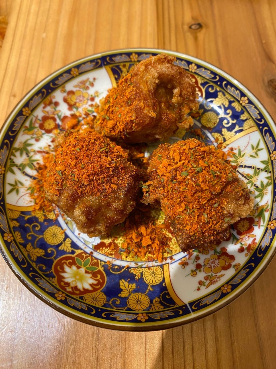 唐揚げ3つに複数の香辛料が掛かった一品